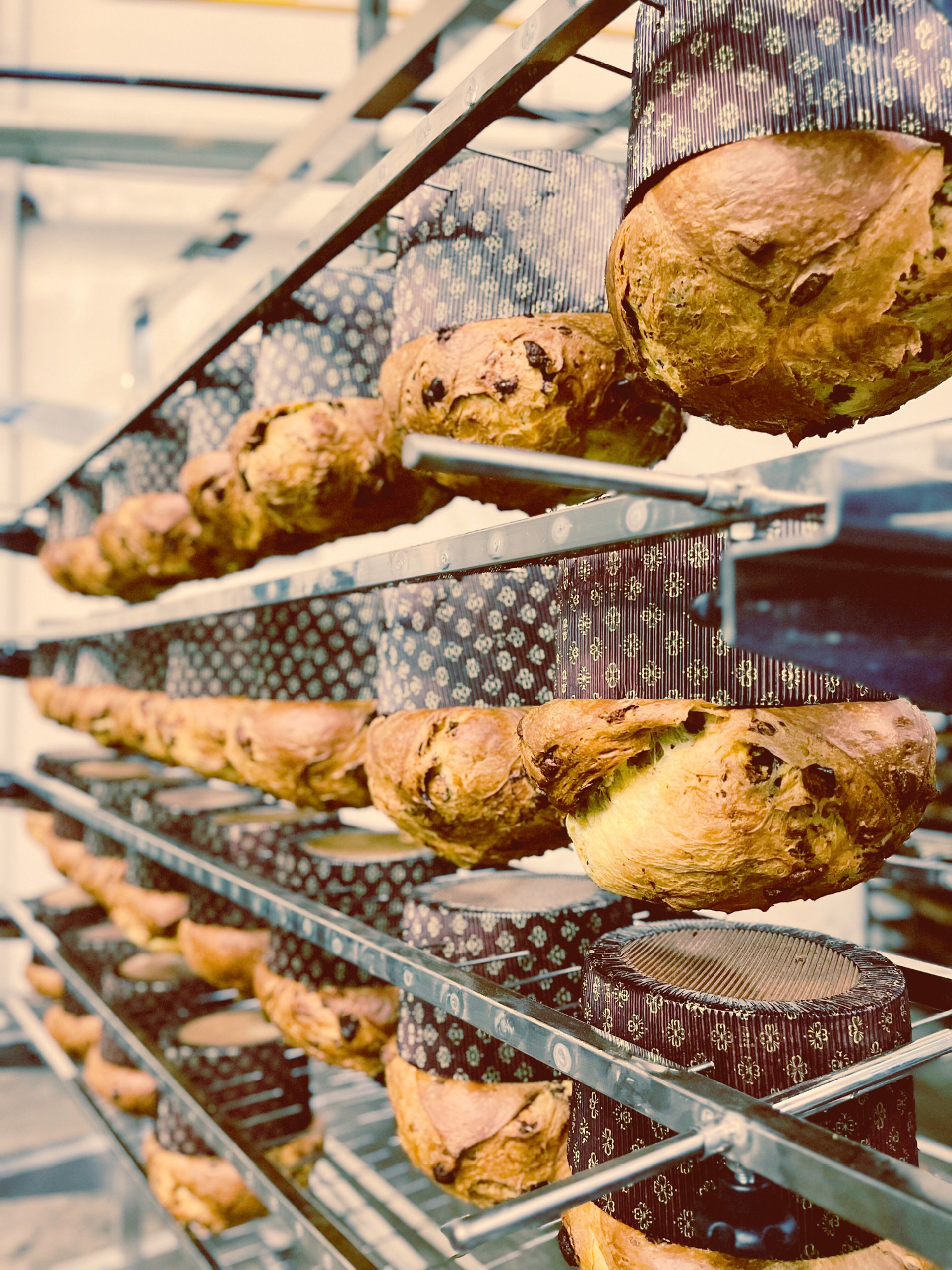 Forno em temperatura controlada, calor no tempo certo e resfriamento cuidadoso. Isso preserva a umidade, realça o aroma e entrega cor dourada uniforme — sinais de um panettone bem feito.
